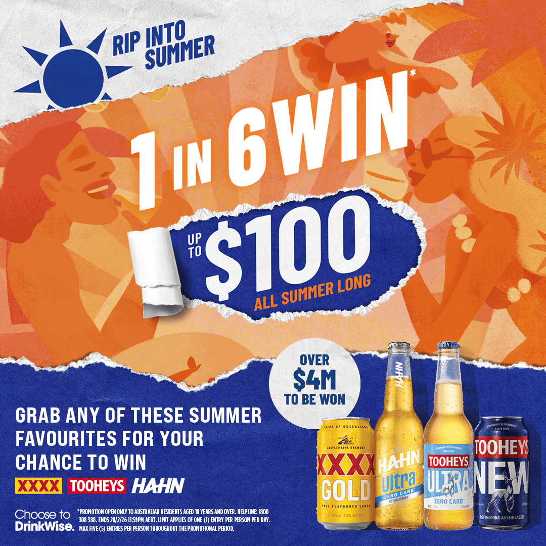 Grab any specially marked pack of XXXX, Hahn or Tooheys for your chance to win!