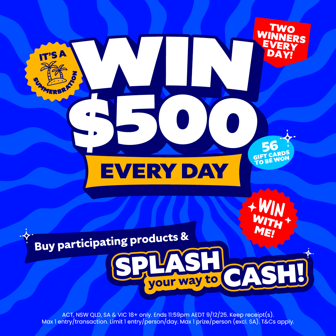 56 Gift Cards to be won. Buy participating products & splash your way to cash!